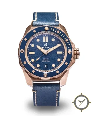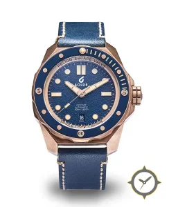 A Dive watch with a bold 53.5mm presence on the wrist, crafted from bronze featuring a blue dial with a unique grained/pebble texture finish.