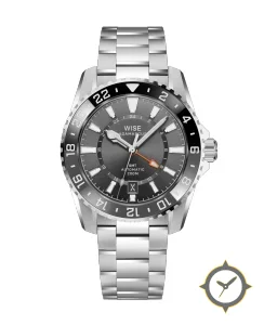 A GMT watch with a versatile 38.5mm case, that suits most wrists, crafted from stainless steel featuring a gray dial with a unique sunburst finish and a true GMT complication for tracking a second time zone.