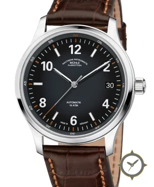 A Field watch with a bold 45mm presence on the wrist, crafted from stainless steel featuring a black dial with a unique matte finish.