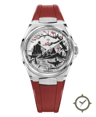 A Sports watch with a bold 48.5mm presence on the wrist, crafted from stainless steel featuring a white dial with a unique textured, paper/enamel-like surface with printed/painted artwork finish.