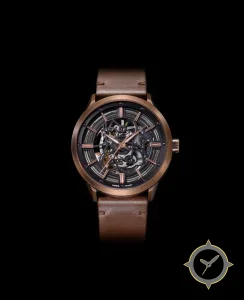 A Skeleton watch with a versatile 39mm case, that suits most wrists, crafted from bronze featuring a black dial with a unique open-work skeleton with visible movement finish.