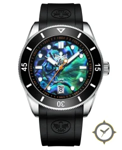 A Dive watch with a versatile 40.5mm case, that suits most wrists, crafted from stainless steel featuring a turquoise dial with a unique abalone / mother-of-pearl iridescent finish.