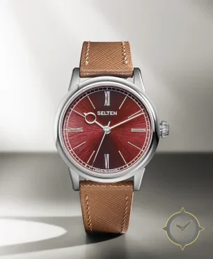A Dress watch with a vintage-inspired 32.5mm case, crafted from stainless steel featuring a red dial with a unique grand-feu enamel with sunburst brushing/radiant texture finish.
