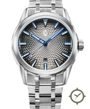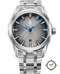 A Sports watch with a bold 49mm presence on the wrist, crafted from stainless steel featuring a silver dial with a unique guilloché spiral (textured concentric pattern) finish.