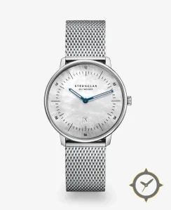 A Minimalist watch with a vintage-inspired 35.5mm case, crafted from stainless steel featuring a white dial with a unique mother-of-pearl finish.
