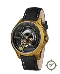 A Skeleton watch with a vintage-inspired 37.5mm case, crafted from gold featuring a black dial with a unique ribbed and open-work (skeleton) finish.