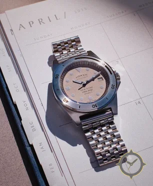 A Dive watch with a bold 44mm presence on the wrist, crafted from stainless steel featuring a white dial with a unique lightly grained / sand-texture finish.