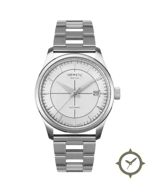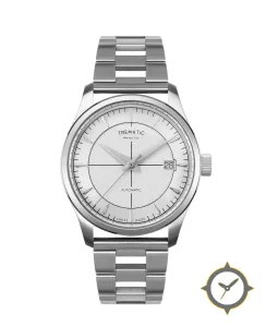 A Dress watch with a vintage-inspired 32.5mm case, crafted from stainless steel featuring a white dial with a unique light grained / frosted texture finish.