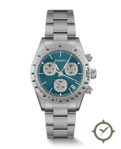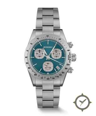 A Chronograph watch with a bold 47mm presence on the wrist, crafted from stainless steel featuring a turquoise dial with a unique sunburst (subtle radial brushing) finish.