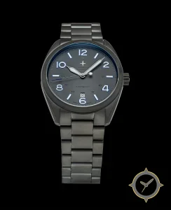 A Field watch with a vintage-inspired 32mm case, crafted from stainless steel featuring a gray dial with a unique matte finish.