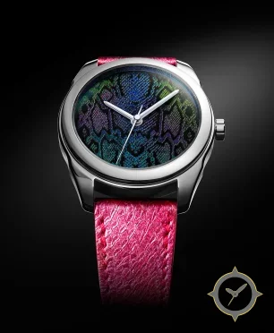 A Dress watch with a bold 44mm presence on the wrist, crafted from stainless steel featuring a blue dial with a unique iridescent, textured (embossed/woven) finish finish.