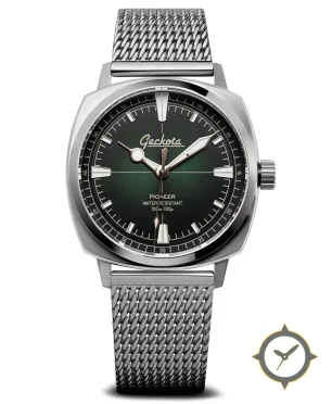 A Vintage watch with a bold 42mm presence on the wrist, crafted from stainless steel featuring a green dial with a unique sunburst finish.