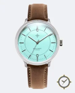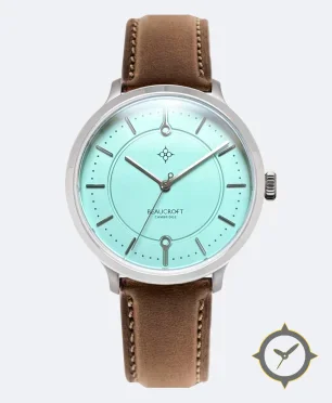 A Dress watch with a vintage-inspired 34mm case, crafted from stainless steel featuring a turquoise dial with a unique matte finish.