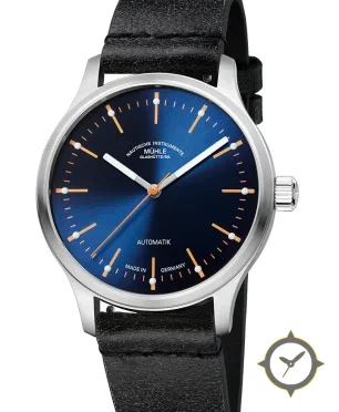 A Minimalist watch with a bold 45.5mm presence on the wrist, crafted from stainless steel featuring a blue dial with a unique radial sunburst finish.