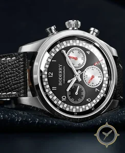 A Chronograph watch with a vintage-inspired 35mm case, crafted from stainless steel featuring a black dial with a unique matte finish.