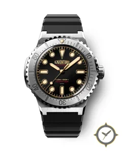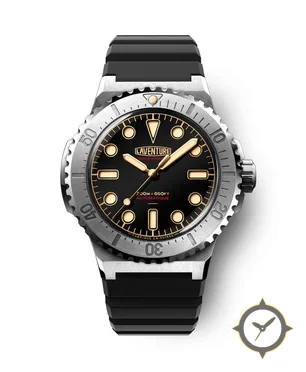 A Dive watch with a vintage-inspired 34mm case, crafted from stainless steel featuring a black dial with a unique matte finish.