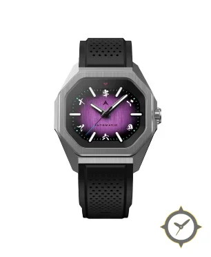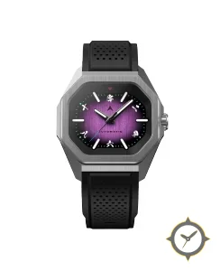 A Sports watch with a bold 41.5mm presence on the wrist, crafted from stainless steel featuring a purple dial with a unique vertical brushed finish.
