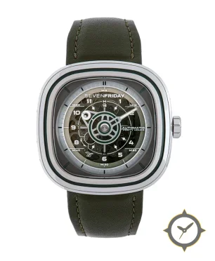 A Skeleton watch with a vintage-inspired 37.5mm case, crafted from stainless steel featuring a green dial with a unique open-worked (skeletonised), multi-layered discs finish.
