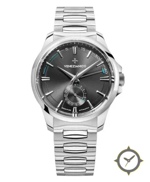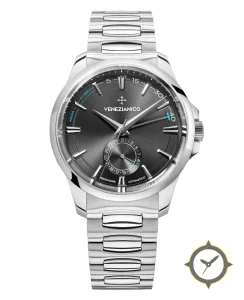 A Luxury watch with a bold 46mm presence on the wrist, crafted from stainless steel featuring a gray dial with a unique sunburst finish and a helpful power reserve indicator.