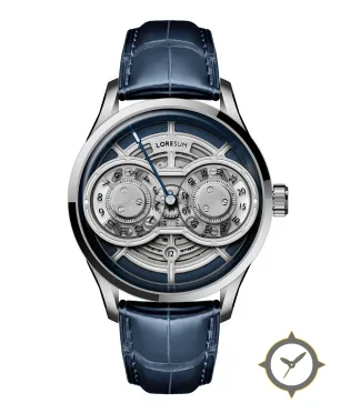 A Skeleton watch with a versatile 39.5mm case, that suits most wrists, crafted from stainless steel featuring a silver dial with a unique open-worked skeleton with visible movement and a blue outer ring finish.