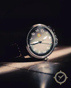 A Pilot watch, crafted from stainless steel featuring a black dial with a unique matte with slight radial gradient finish.