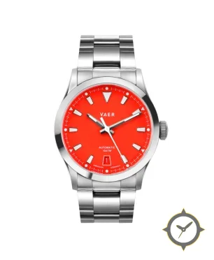 A Sports watch with a vintage-inspired 34.5mm case, crafted from stainless steel featuring a red dial with a unique matte finish.