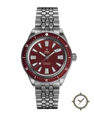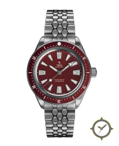 A Dive watch with a bold 47mm presence on the wrist, crafted from stainless steel featuring a crimson dial with a unique vertical-brushed finish.