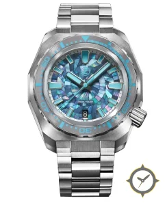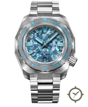 A Dive watch with a bold 43.5mm presence on the wrist, crafted from stainless steel featuring a blue dial with a unique mother-of-pearl mosaic/abalone inlay finish.