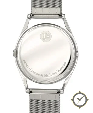 A Minimalist watch with a vintage-inspired 33.5mm case, crafted from stainless steel featuring a striking white dial.