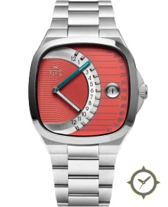 A Dress watch with a bold 45mm presence on the wrist, crafted from stainless steel featuring a red dial with a unique concentric ridges on left half with fine horizontal lines on right half finish.