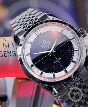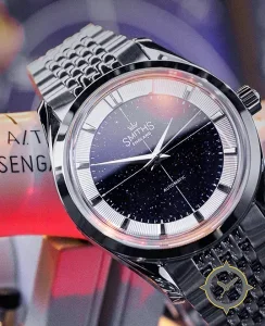 A Dress watch with a vintage-inspired 32.5mm case, crafted from stainless steel featuring a navy dial with a unique aventurine (sparkling) finish.
