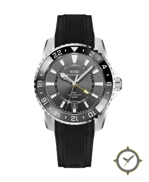 A GMT watch with a vintage-inspired 37mm case, crafted from stainless steel featuring a gray dial with a unique sunburst finish and a true GMT complication for tracking a second time zone.