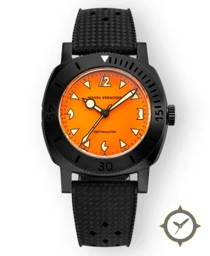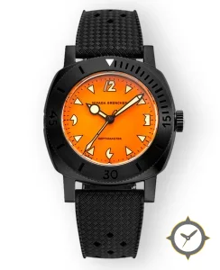 A Dive watch with a vintage-inspired 33mm case, crafted from Coating featuring a orange dial with a unique matte finish.