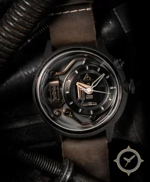 A Skeleton watch with a bold 53mm presence on the wrist, crafted from stainless steel featuring a black dial with a unique matte with exposed electronic components / industrial finish finish.