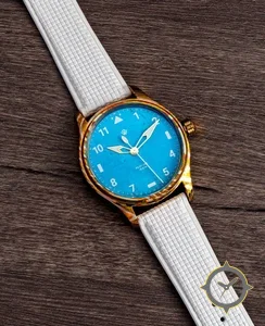 A Pilot watch with a versatile 40.5mm case, that suits most wrists, crafted from gold featuring a turquoise dial with a unique matte finish.