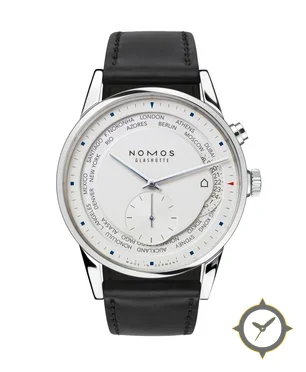 A World Timer watch with a bold 47mm presence on the wrist, crafted from stainless steel featuring a white dial with a unique matte finish, perfect for the global traveler with its world-time function.