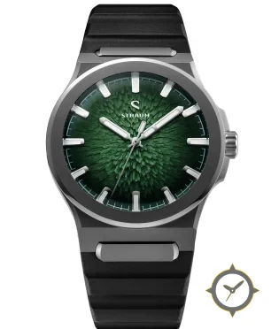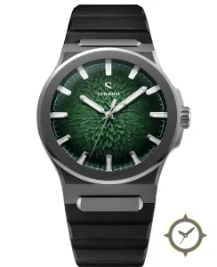 A Sports watch with a vintage-inspired 34.5mm case, crafted from titanium featuring a green dial with a unique three-dimensional textured surface with radial raised shard-like relief finish.