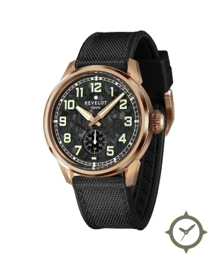 A Field watch with a bold 43mm presence on the wrist, crafted from gold featuring a black dial with a unique forged carbon / marbled carbon texture finish.