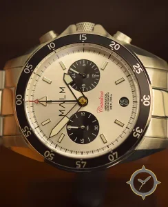A Chronograph watch with a vintage-inspired 35mm case, crafted from stainless steel featuring a white dial with an intricate panda pattern.