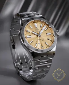 A Sports watch with a versatile 40mm case, that suits most wrists, crafted from stainless steel featuring a gold dial with a unique sunburst finish.