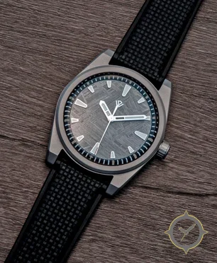 A Sports watch with a vintage-inspired 33.5mm case, crafted from stainless steel featuring a gray dial with a unique meteorite finish.