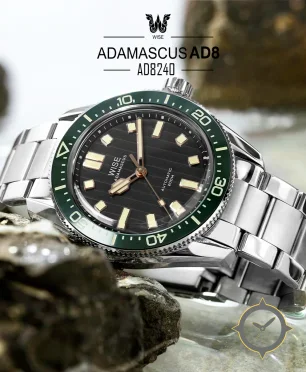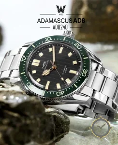 A Dive watch with a bold 41.5mm presence on the wrist, crafted from stainless steel featuring a black dial with a unique horizontal striped / teak-style finish finish.