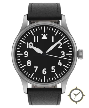 A Pilot watch with a bold 48mm presence on the wrist, crafted from stainless steel featuring a black dial with a unique matte finish.