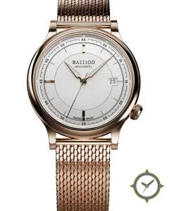 A Dress watch with a versatile 41mm case, that suits most wrists, crafted from gold featuring a white dial with a unique subtle grained center with smooth outer chapter ring finish.