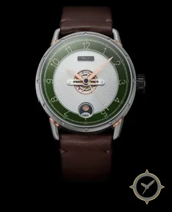A Dress watch with a bold 46mm presence on the wrist, crafted from stainless steel featuring a green dial with a unique radial guilloché (textured) finish.