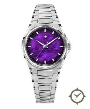 A Luxury watch with a vintage-inspired 31.5mm case, crafted from stainless steel featuring a purple dial with a unique mother-of-pearl / marbled finish.