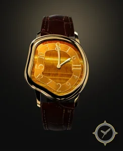 A Luxury watch, crafted from gold featuring a brown dial with a unique chatoyant stone / tiger's-eye like texture finish.
