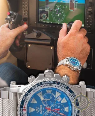 A Aviation watch with a bold 54mm presence on the wrist, crafted from stainless steel featuring a blue dial with a unique sunburst finish, perfect for the global traveler with its world-time function.