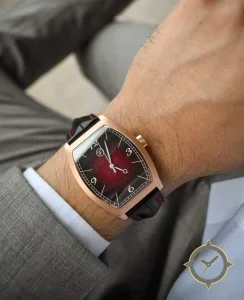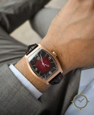 A Dress watch with a vintage-inspired 33.5mm case, crafted from gold featuring a red dial with a unique guilloche sunburst (textured wave pattern) finish.