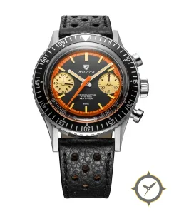 A Chronograph watch with a vintage-inspired 32mm case, crafted from stainless steel featuring a black dial with a unique matte center with glossy orange chapter ring finish.